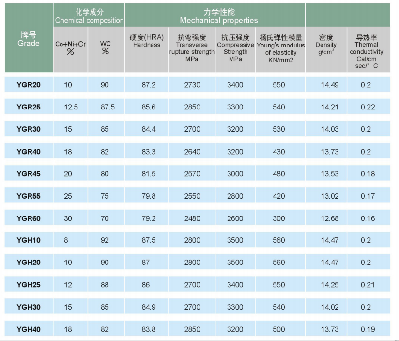 硬質合金輥環 碳化鎢輥環牌號性能推薦表