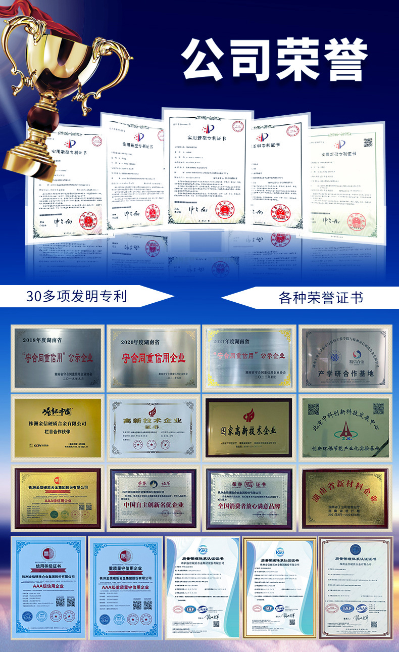 材質(zhì)優(yōu)勢(shì):碳化鎢基體結(jié)合鈷粘結(jié)相,致密度≥99.5%,抗磨粒磨損性能優(yōu)異,減少磨削過(guò)程中的刃口崩裂;
